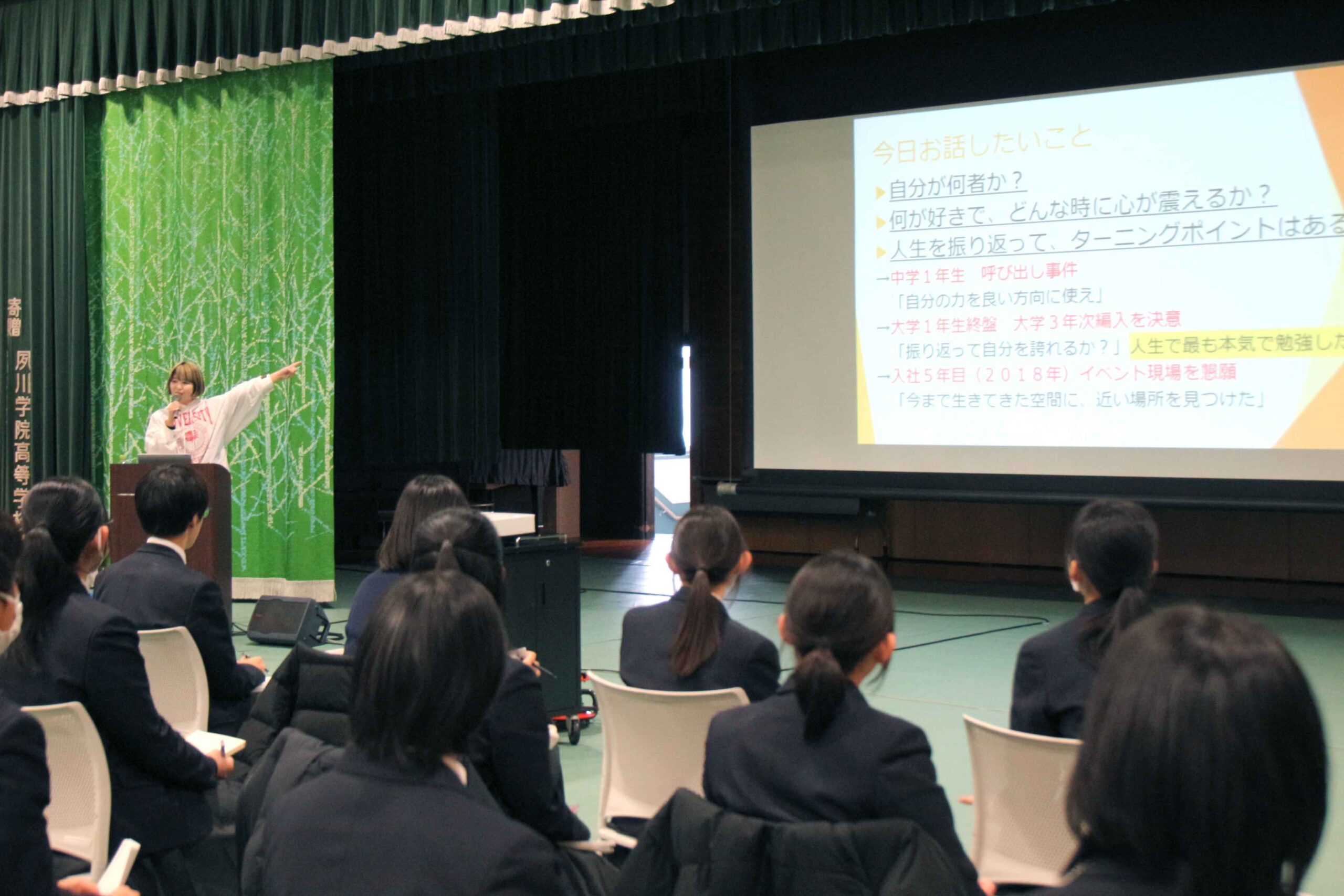 12月11日(水) 本日、讀賣テレビのコンテンツ戦略局イベントビジネスセンターに所属する門上由佳さんにお越しいただき、希望者対象に講演会を開催しました。門上さんは制作局で音楽番組やバラエティー番組などを担当した後、現在「音楽イベントプロデューサー」として活躍されています。講演会後は、広報推進委員を中心とした有志メンバーでインタビューを行いました。インタビュー内容は、後日発行する校内新聞「夕刊須磨夙」にて掲載予定です。