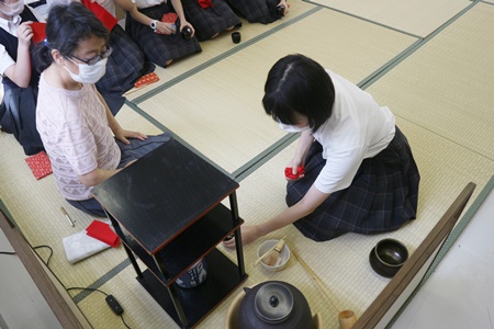 様々な文化部も活動を再開しています。茶道部は新入部員を迎えて落ち着いた雰囲気の中で活動していました。