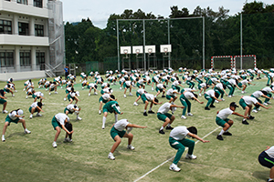 J1、J2、S1(中1~3)学年合同の「ソーラン節」の練習時間を先週に設けていました。が、やり始めて雨。担当体育科教員のため息。本日は晴れました。午後の体育の時間を使って大いに練習をしました。