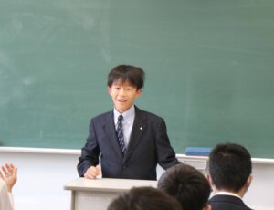 PowerPointの写真の寺の名前は?の質問に「三十三間堂です」と生徒が答えていました。最後に生徒からの質問、そして学年の教員からの質問もありました。
