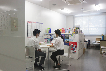 自分のやりたいこと、自分が学びたいことが決まり、総合型選抜受験を希望する生徒に学年教員が対応。面接での自己アピールについて細かくアドバイスをしていました。