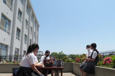 今日は雲ひとつない青空で、スッキリと晴れ渡った1日でした。グラウンドでは太陽の光を浴びながら体育の授業が行われていたり、昼休みの中庭テラスでは、昼食を食べている生徒が増えてきました。生徒たちは気持ちの良い一日を過ごしていました。