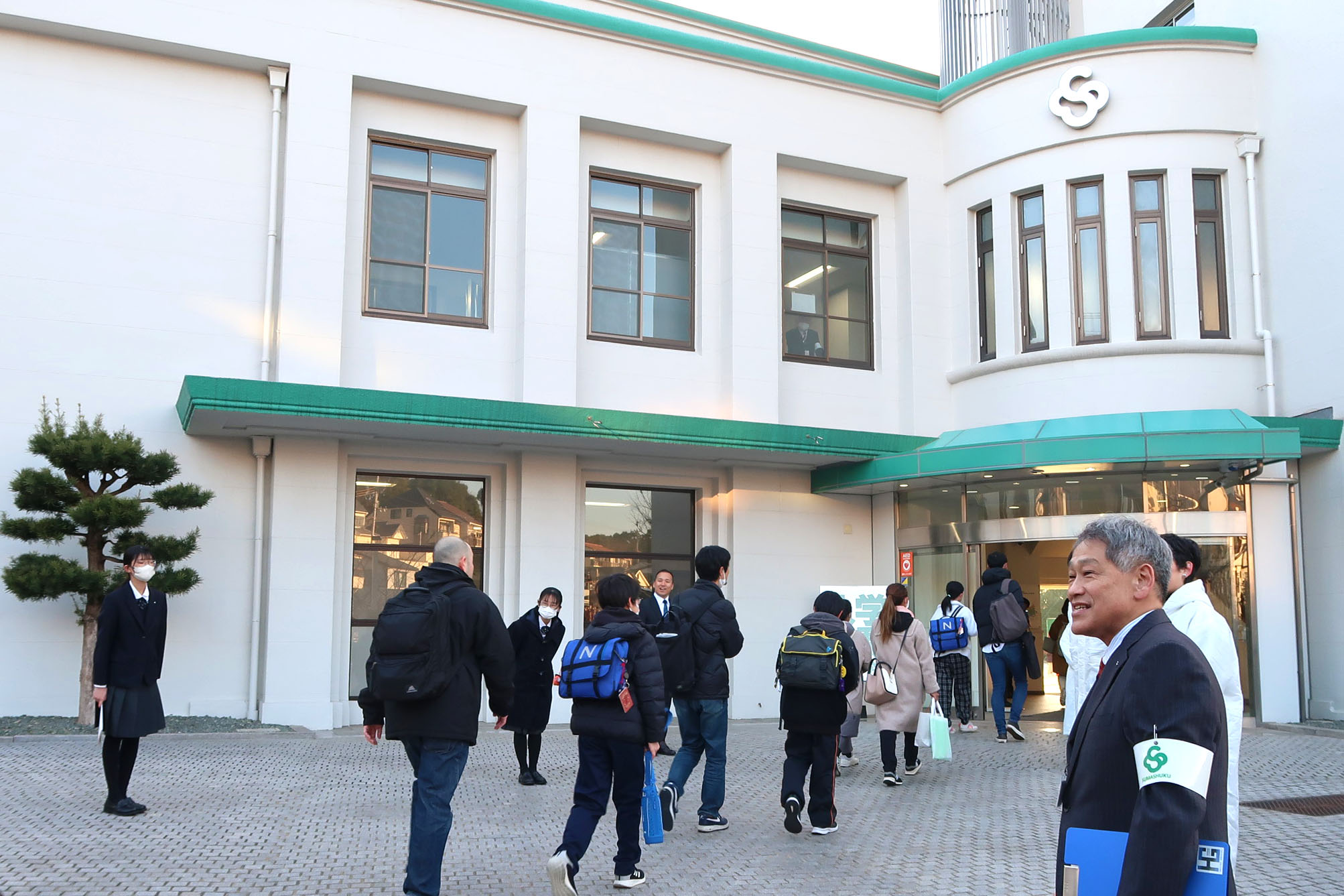 第1回目の受験生が保護者の方と共に、夙川中学校に登校してきました。教職員と在校生の補助生徒で挨拶をし、出迎えました。