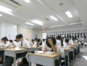 金曜日の1時間目は「PMTM(プロジェクトマネジメント・タイムマネジメント)」の時間。生徒たちは今週の振り返りをもとに、来週に向けた計画を立てます。目標と行動、スケジュールをシートに書き出すことで、日々の過ごし方を見直し、主体的な学びを促しています。