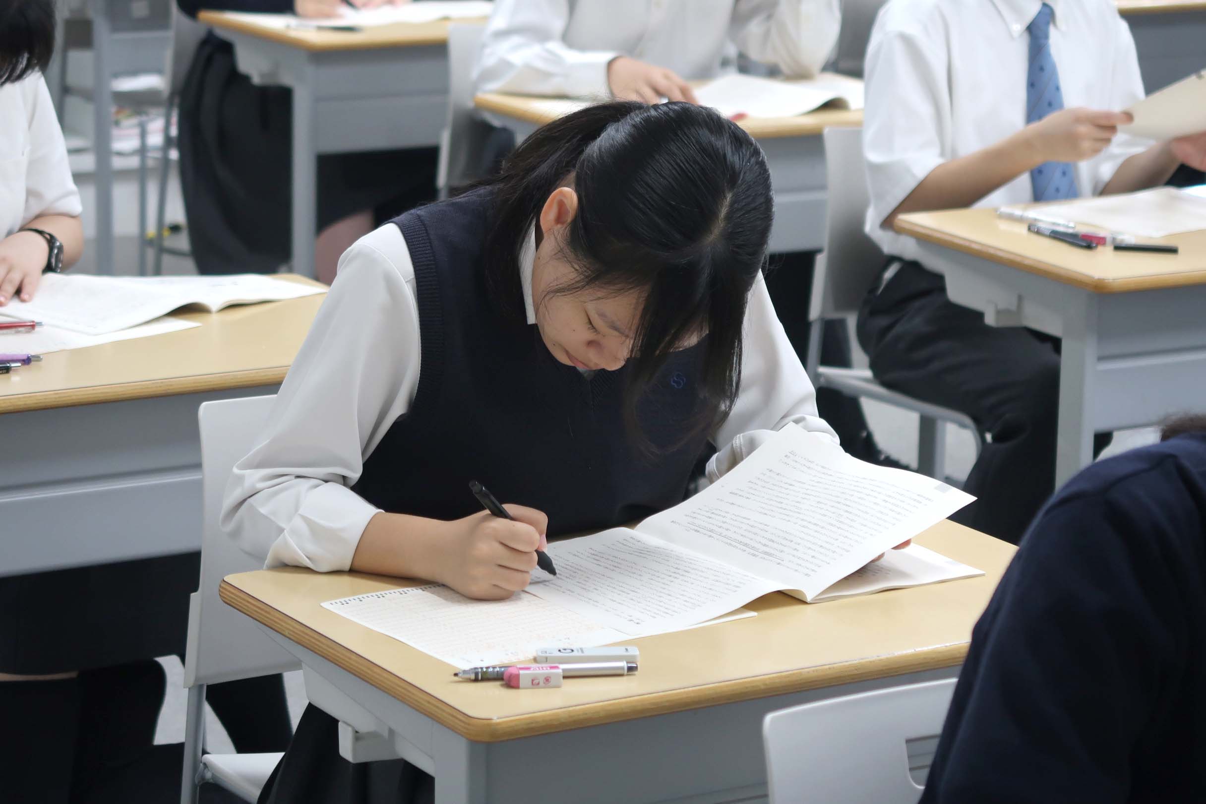 9月9日(火) 本日からの2日間、K3/V2(高3)生は大学入学共通テスト模試に挑みます。夏休みの成果を発揮する場であり、単に点数や偏差値を測るだけでなく、弱点を見つけ課題を明確にする大切な機会です。本番に近い雰囲気を体験し、得意・不得意を把握することで、今後の学習計画につなげていきます。