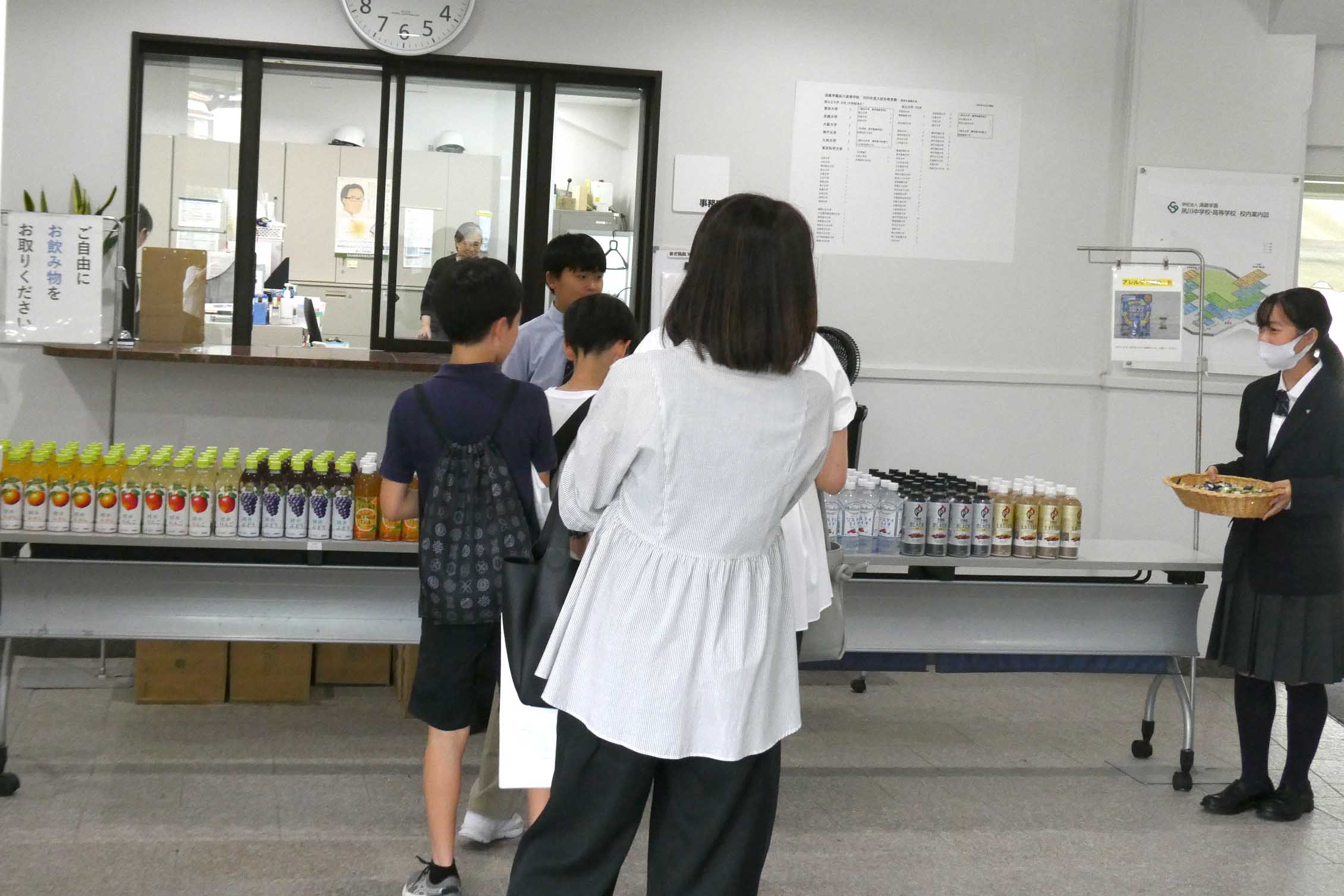 当日は生徒が正門での挨拶や受付、校内案内を担当します。校内にはドリンクコーナーや塩分補給タブレットも設置され、自由にご利用いただきました。