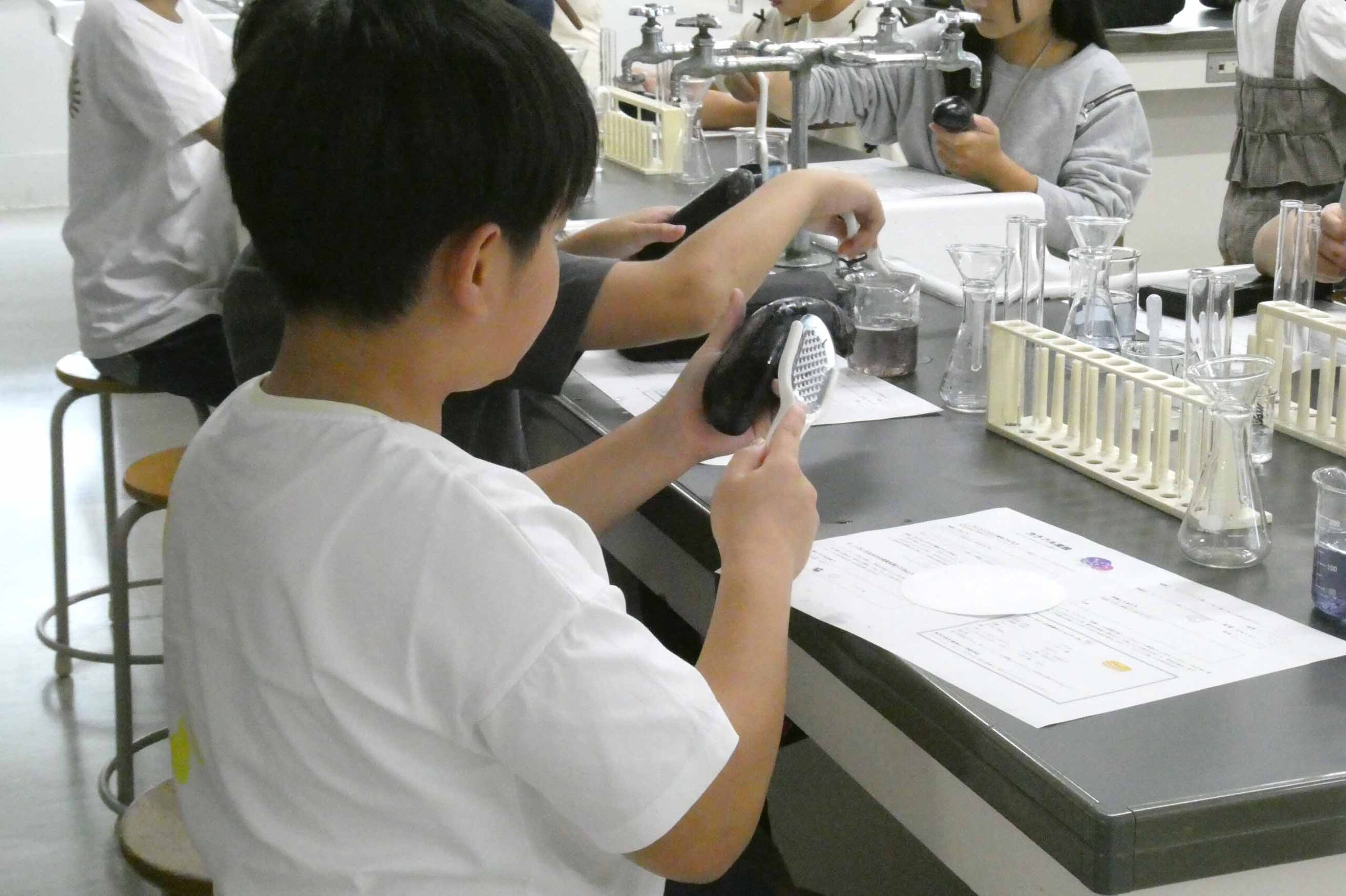 理科体験授業では、身近な材料を使ったカラフル実験に挑戦しました。普段触れない器具や薬品を扱い、化学の不思議や楽しさを体感してもらいました。
