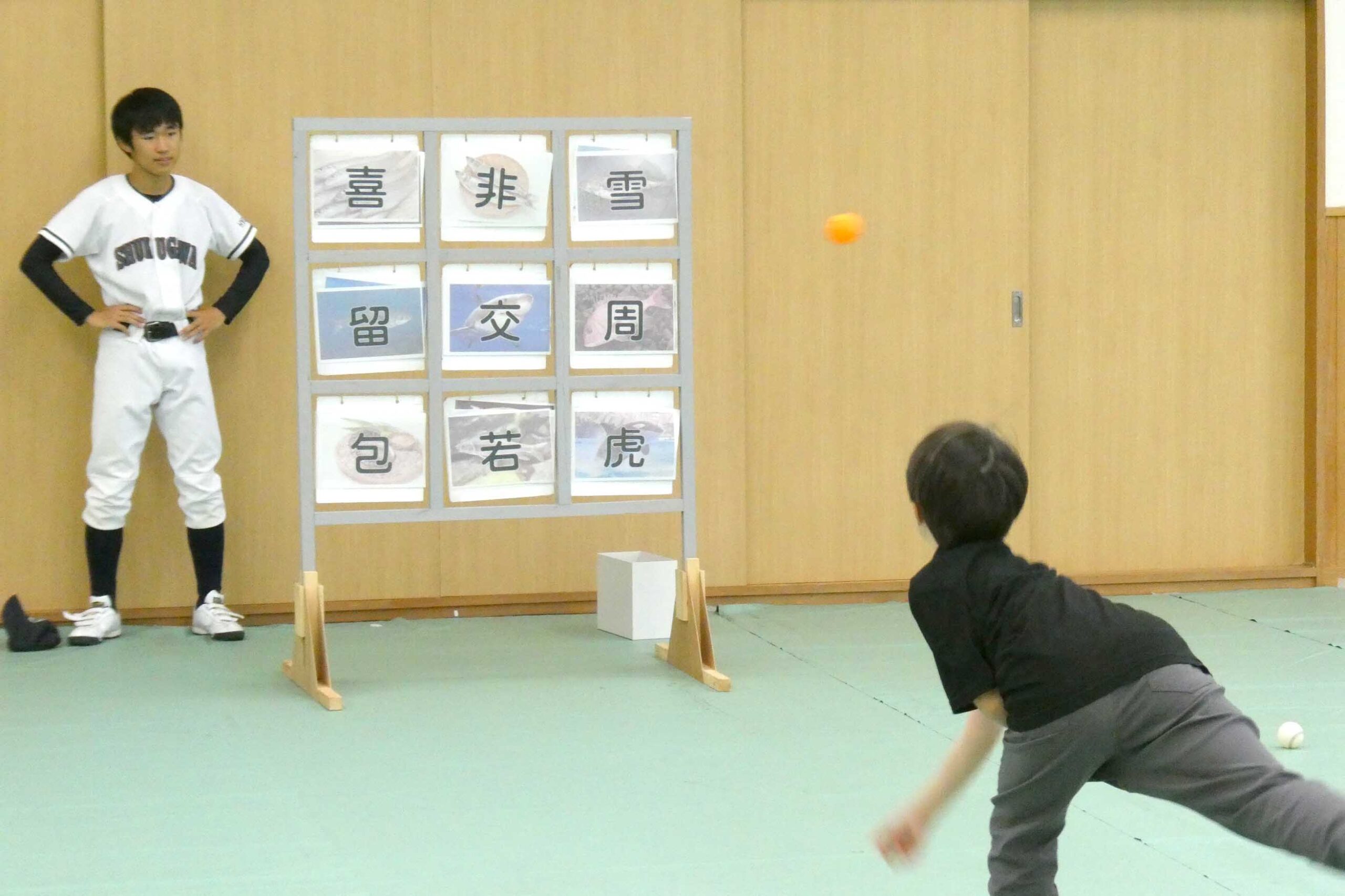 軟式野球部体験では、ストラックアウトに挑戦。その後、的に書かれた漢字を組み合わせる漢字クイズにも挑戦しました。楽しみながら学べる、工夫されたプログラムです。