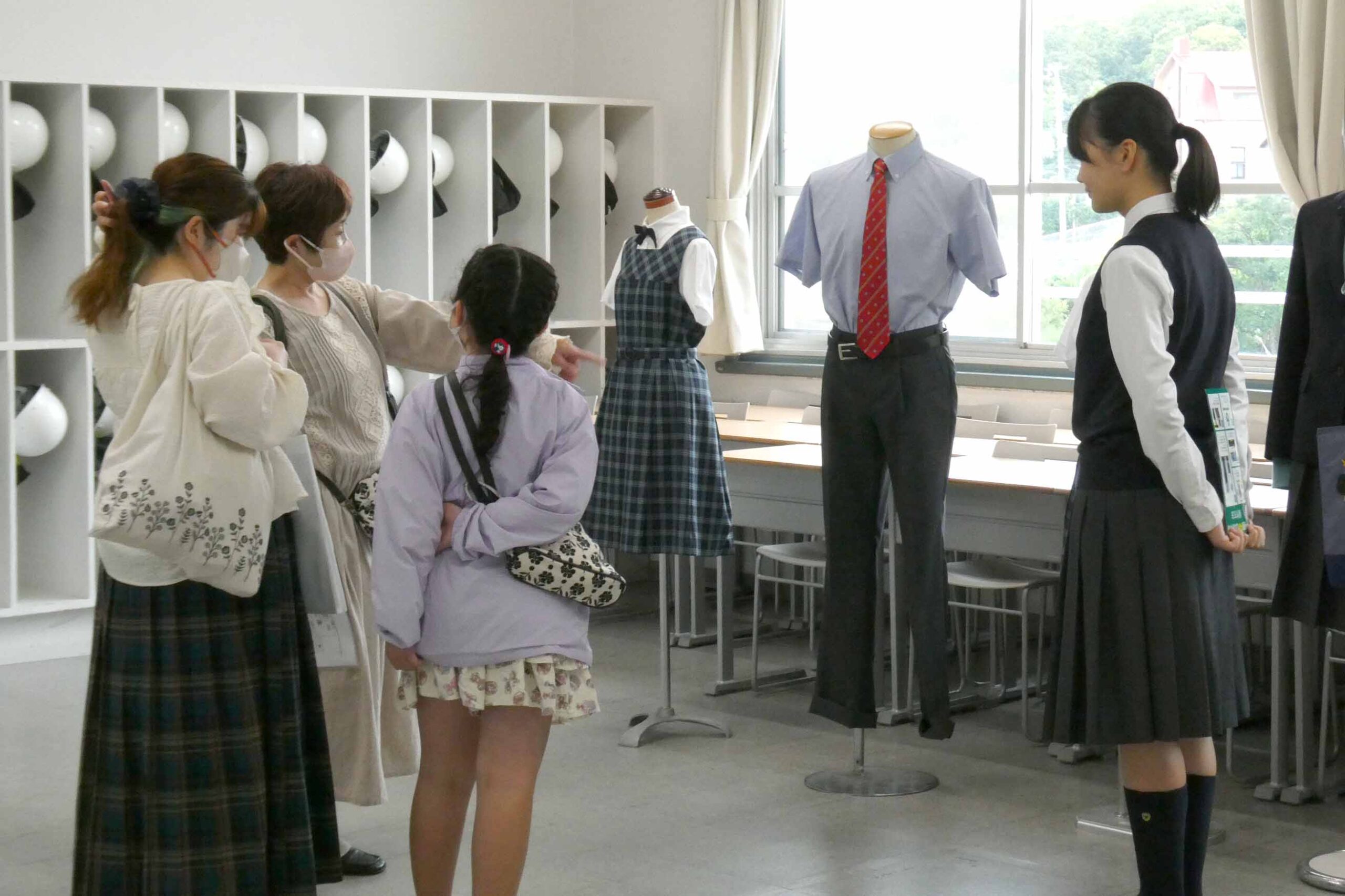 制服AR体験ブースでは、本校の制服を展示するとともに、スマートフォンを使って実際に着用しているような写真を撮影できます。参加者は制服を着たイメージを楽しんでいました。