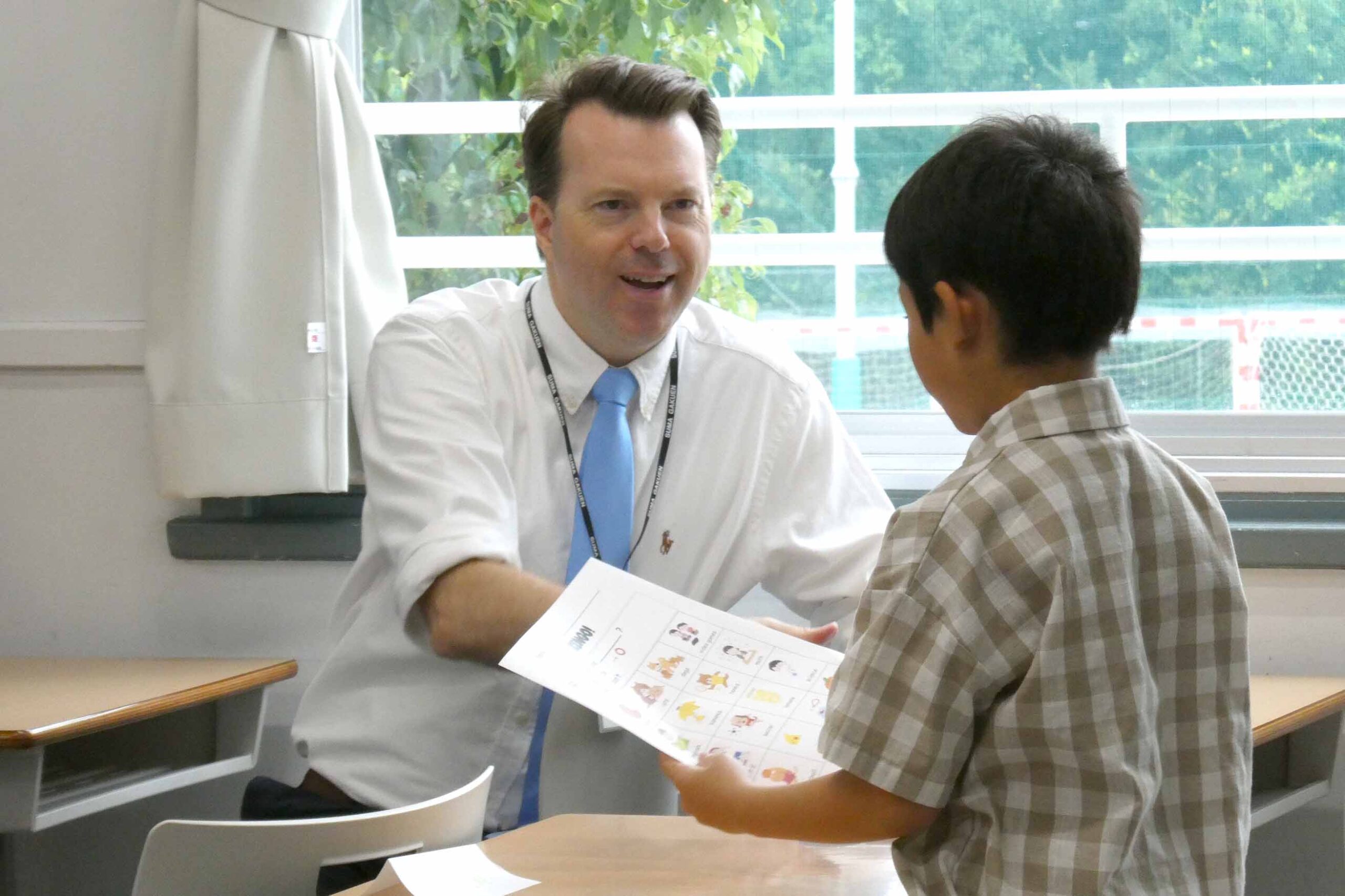 英会話体験では、ビンゴ形式のアクティビティを通して英語で交流しました。教員や生徒と英語でやり取りを行い、マスを埋めながら交流を楽しんでいました。