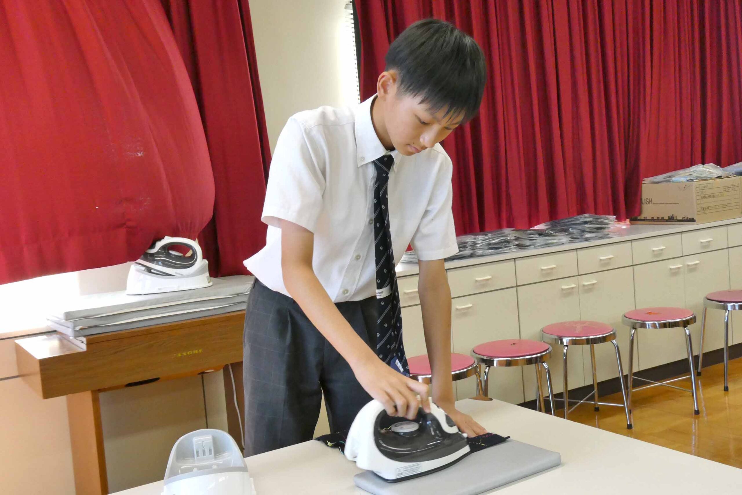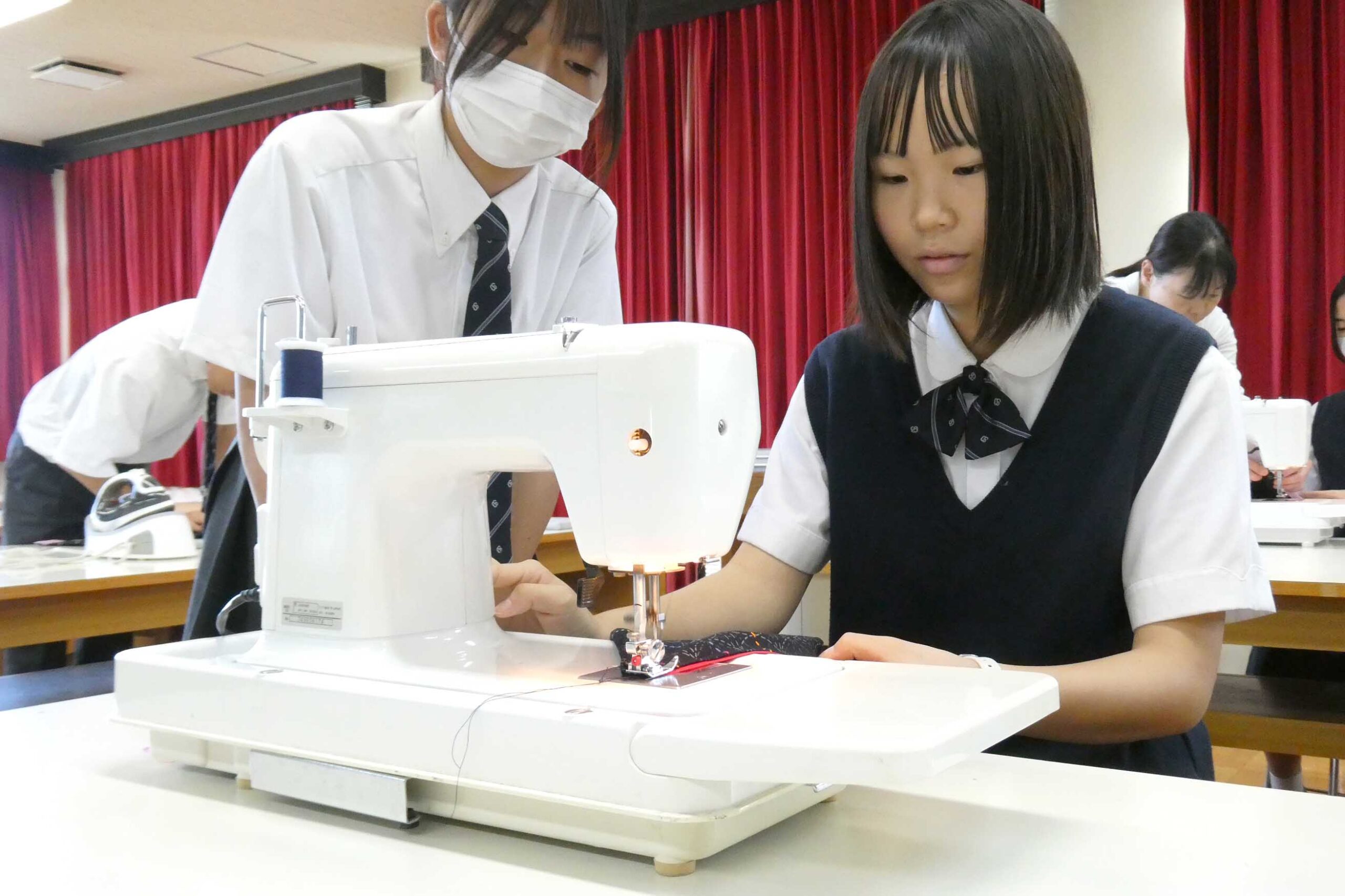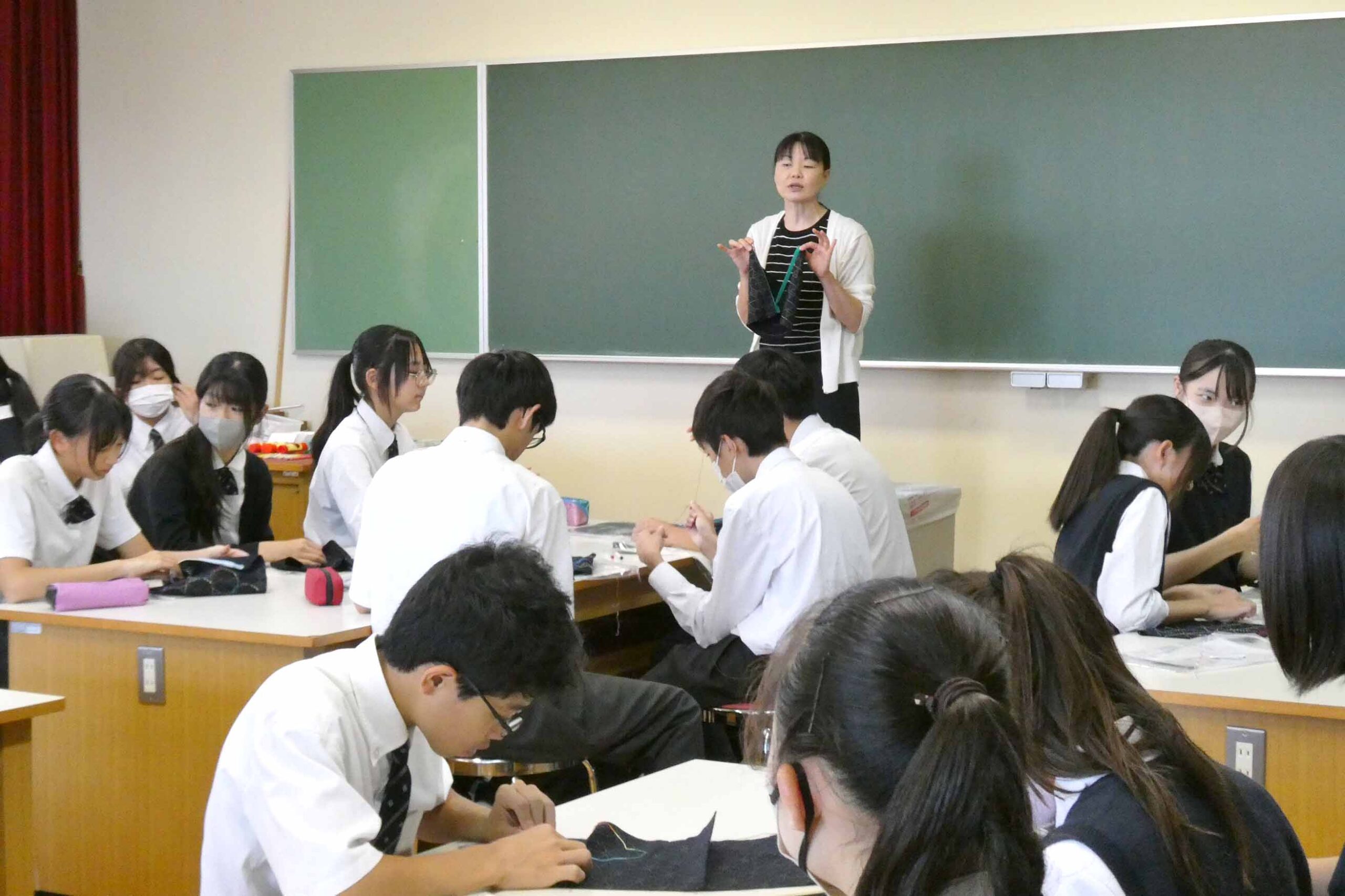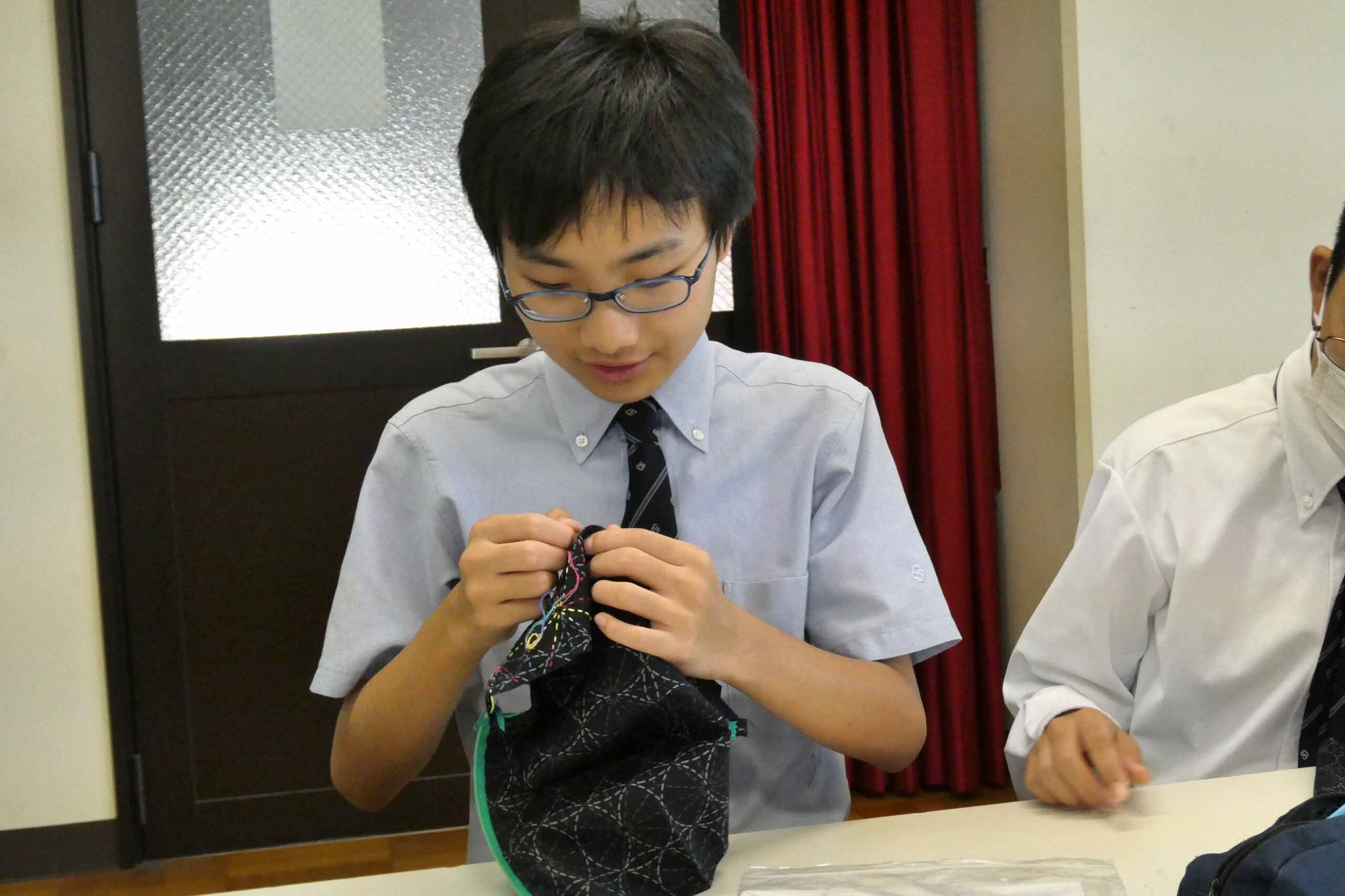 J2(中2)学年の家庭科では、アジア研修旅行に向けて自国の文化を学びます。今回は「日本の衣文化」に注目し、江戸時代に東北地方の農民から生まれた伝統手芸「刺し子」に挑戦。生徒たちは刺し子の技法でテトラポーチ作りに取り組み、細かい縫い目や模様を楽しみながら、昔から受け継がれる技を体験しています。