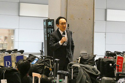 関西国際空港に集合し、生徒代表の司会で出発式を実施しました。高校校長から激励の言葉を受け、生徒たちは期待を胸に、約11時間のフライトでアメリカへ向かいました。