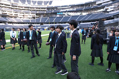 続いて訪れたのは、ワールドカップやオリンピック会場のソーファイ・スタジアム。控え室やVIPルームを見学し、音楽に合わせたフィールド入場やアメフト体験も楽しみました。