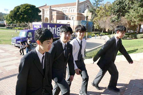 学校交流後、UCLA(カリフォルニア大学ロサンゼルス校)へ移動。学生の案内で見学し、歴史ある建築や広大な敷地のスケールに圧倒され、多くの生徒が感動していました。