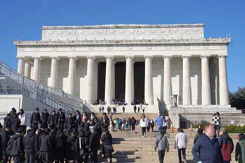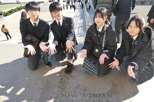 この日の最初の訪問地はリンカーン記念堂。第16代大統領リンカーンを讃える壮大な建築で、映画などで見た光景を実際に目にし、生徒たちは感動していました。