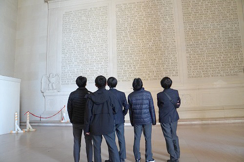 記念堂の内部にはリンカーン像と「人民の、人民による、人民のための政治」で知られるゲティスバーグ演説の全文が刻まれ、生徒たちはその言葉に見入っていました。