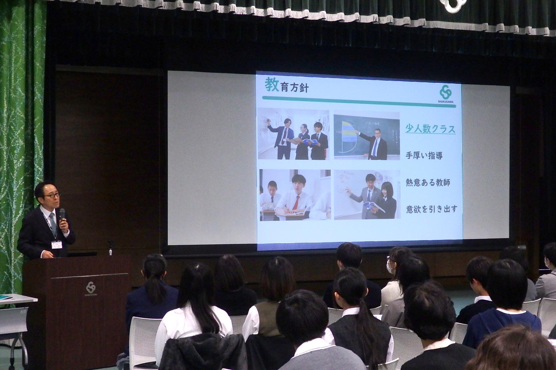 11月1日(土) 今年度2回目となる夙川高校の入試説明会・見学会を開催しました。今回の説明会では、教職員による教育方針や学習内容、学校行事の紹介に加え、在校生が登壇して夙川の魅力を語るコーナーもあり、充実したプログラムとなりました。終了後は、希望者を対象に体験授業や個別相談、校内見学を実施。次回は11月8日(土)に開催予定です。皆さまのご参加を心よりお待ちしています。