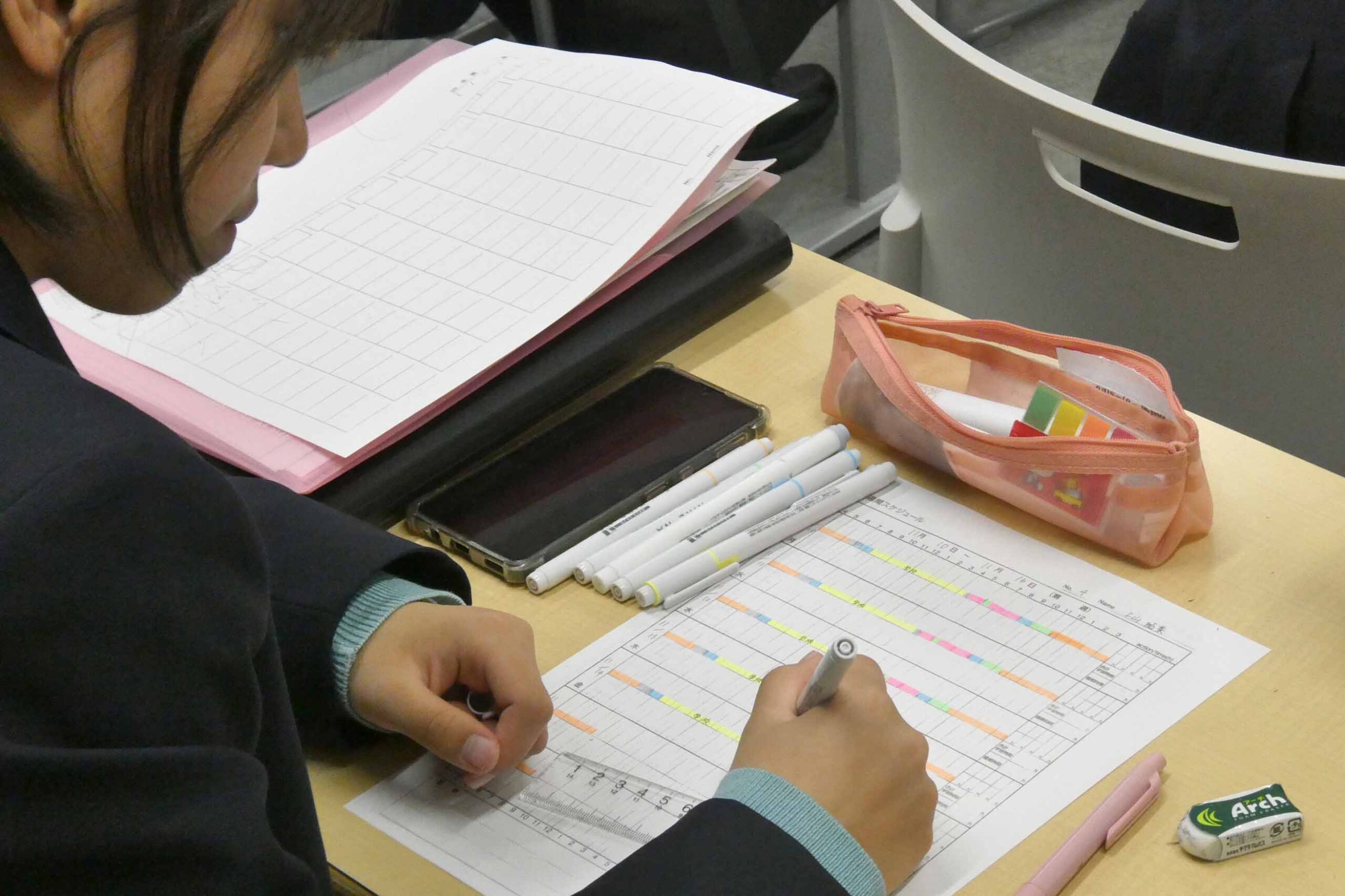本校では毎週金曜の1限に「PMTM(プロジェクトマネジメント・タイムマネジメント)」の時間を設けています。生徒たちはPMシートで「やるべきこと」を整理し、TMシートで「いつするのか」の計画を立てます。研修旅行を終え、第4回定期考査を目前に控えた今、それぞれが工夫を凝らしながらPMTMを活用し、有意義な時間を過ごしています。