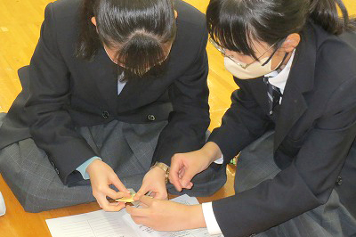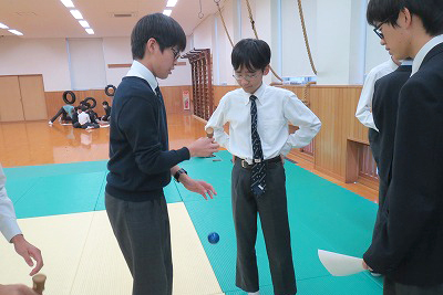 J2学年のアジア研修学校交流会では、現地の生徒とペアになり文化や遊びを英語で紹介します。「けん玉」を教えるグループは、本番に向けて技の練習を重ねていました。