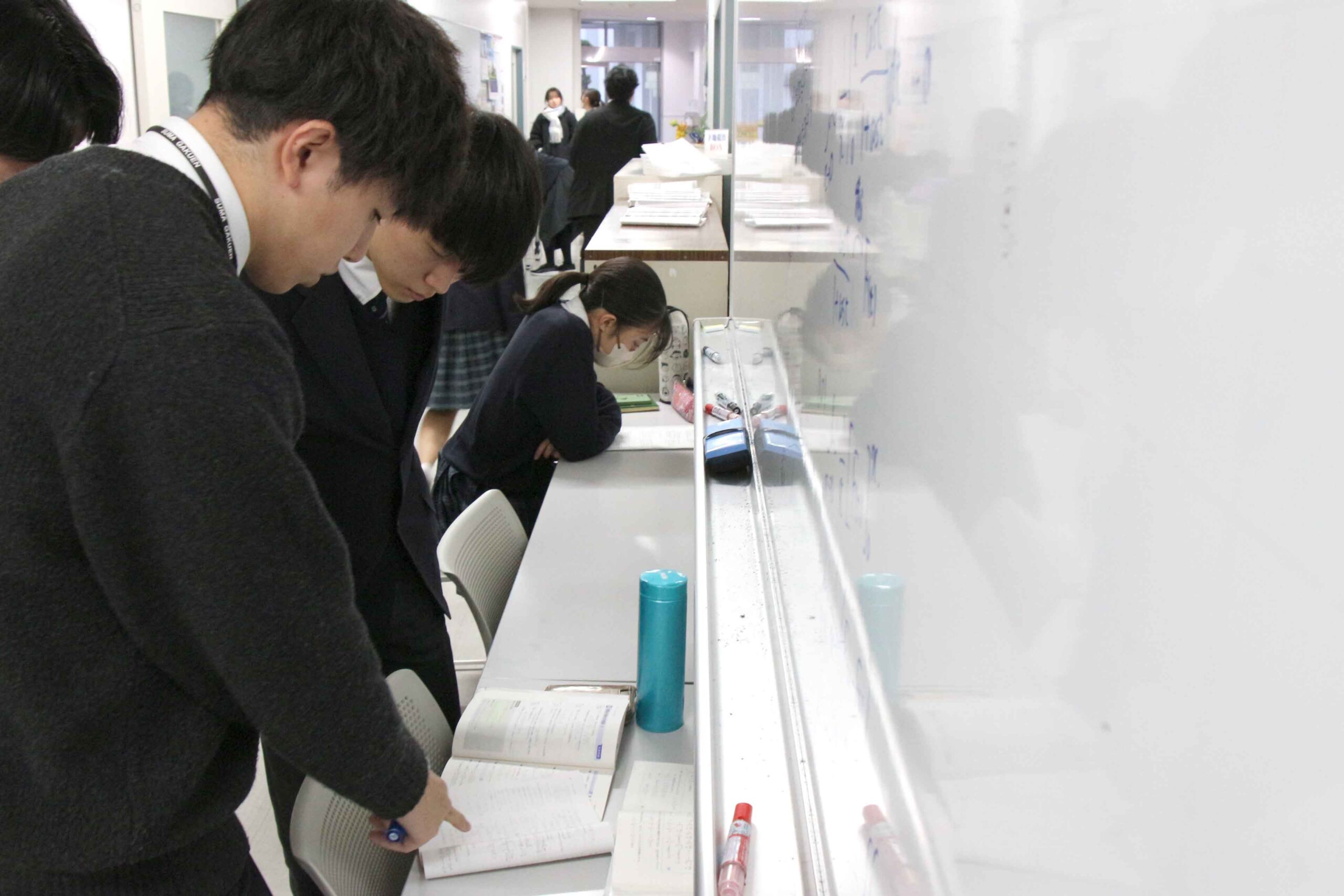 朝や休憩時間、放課後には、職員室前のホワイトボードで個別指導が行われ、考査前にはさらに多くの生徒が集まります。教員が丁寧に解説し、疑問をしっかり解消しています。