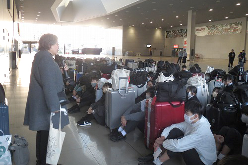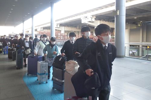朝の送迎バスは6時集合。暗い中を出発しました。関西国際空港に到着後、生徒リーダーの司会で出発式を行い、理事長より研修に臨む心構えについて話がありました。