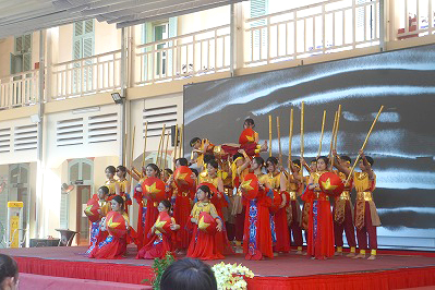 この日は学校交流です。交流校に到着した生徒たちを迎え、ベトナムの生徒による壮大な演舞のオープニングセレモニーが行われます。生徒たちは息をのんで見入っていました。