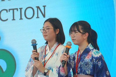 いよいよ夙川の発表です。司会の二人が「Xin chào!」と元気にあいさつすると、ベトナムの生徒も応えてくれました。彼女たちの進行でプレゼンが進みます。