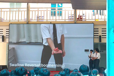こちらのグループは日本の文化を英語で紹介し、こまやけん玉をスクリーンで実演。こまが回ると歓声が上がり、緊張の中やり切った表情が輝きました。