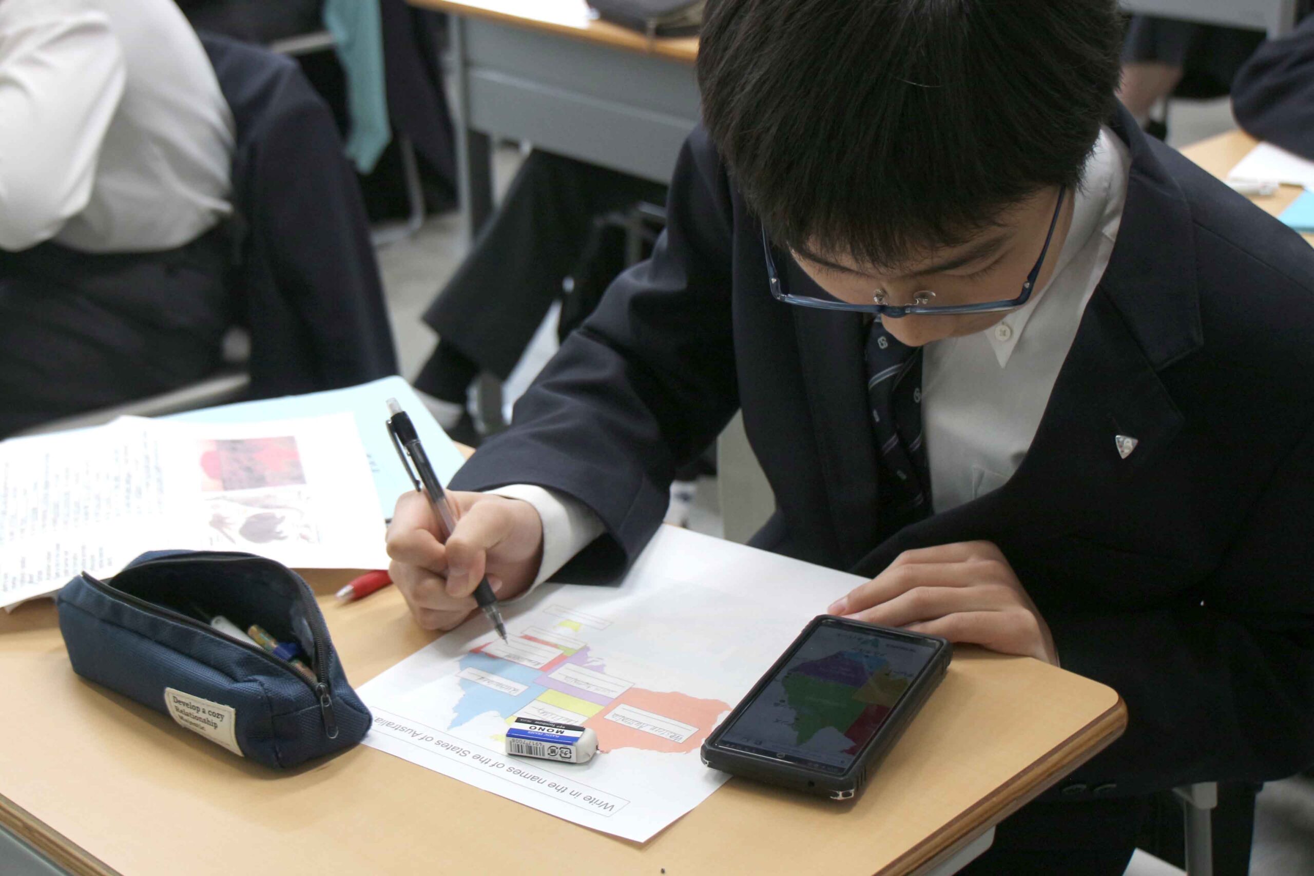 J2(中2)学年では、英語を使って学ぶCLIL(クリル/Content and Language Integrated Learning)の授業を行いました。英語で思考しながら他教科の内容を深めていくのがCLILの特長です。この日は社会と英語を組み合わせ、オーストラリアの地理をテーマに学習しました。言語と内容を同時に扱うことで、理解をより確かなものにしていきます。