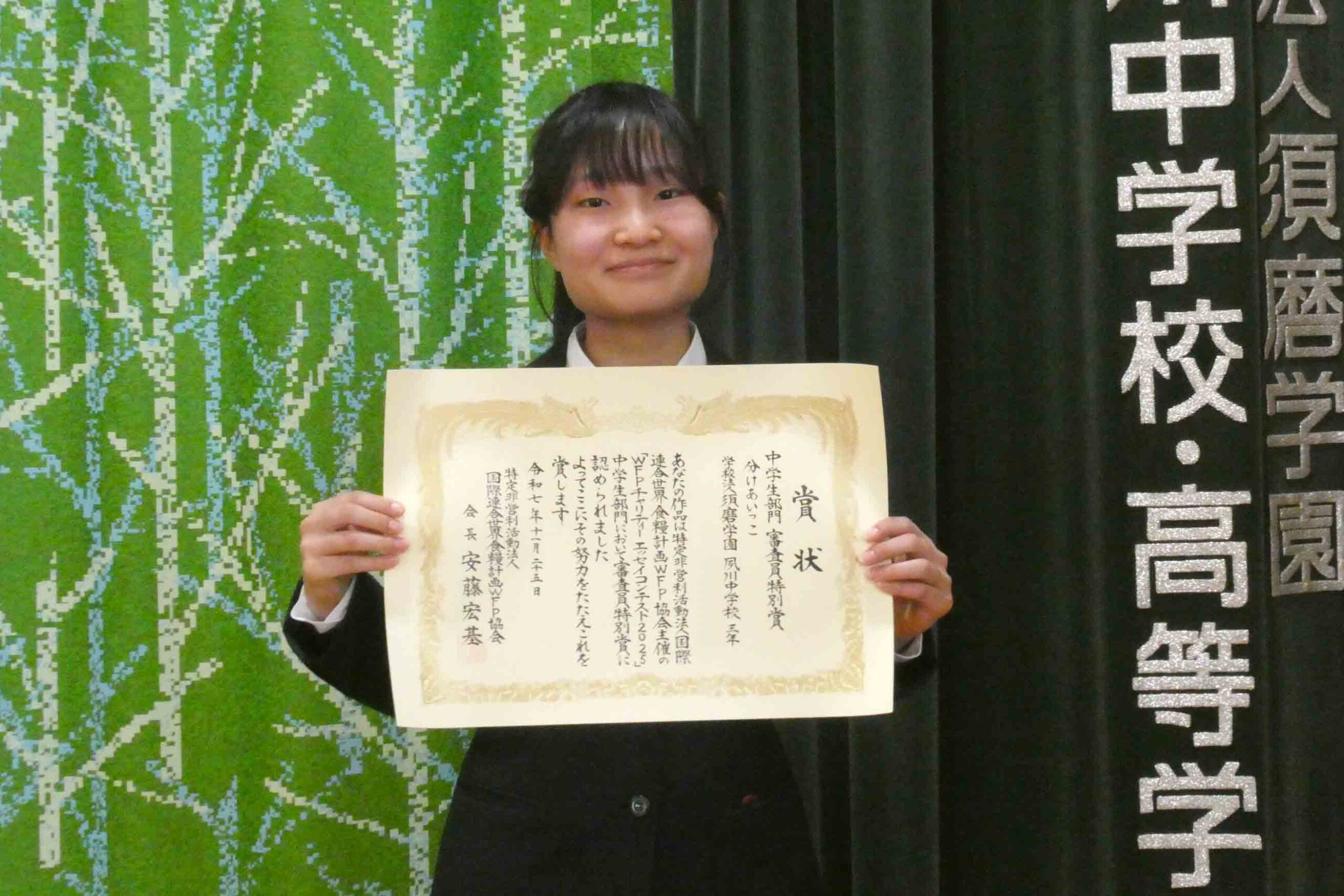 WFPチャリティーエッセイコンテスト2025において、本校のS1(中3)生1名が審査員特別賞を受賞しました。全国から寄せられた21,854通の応募作品の中で、審査員特別賞を受賞したS1生は授賞式に招待されました。応募1作品につき給食2人分が寄付される本コンテストに、本校は毎年継続して取り組んでいます。受賞作品はこちらからご覧いただけます。なお、本校J2(中2)学年の生徒1名も、見事佳作を受賞しました。