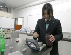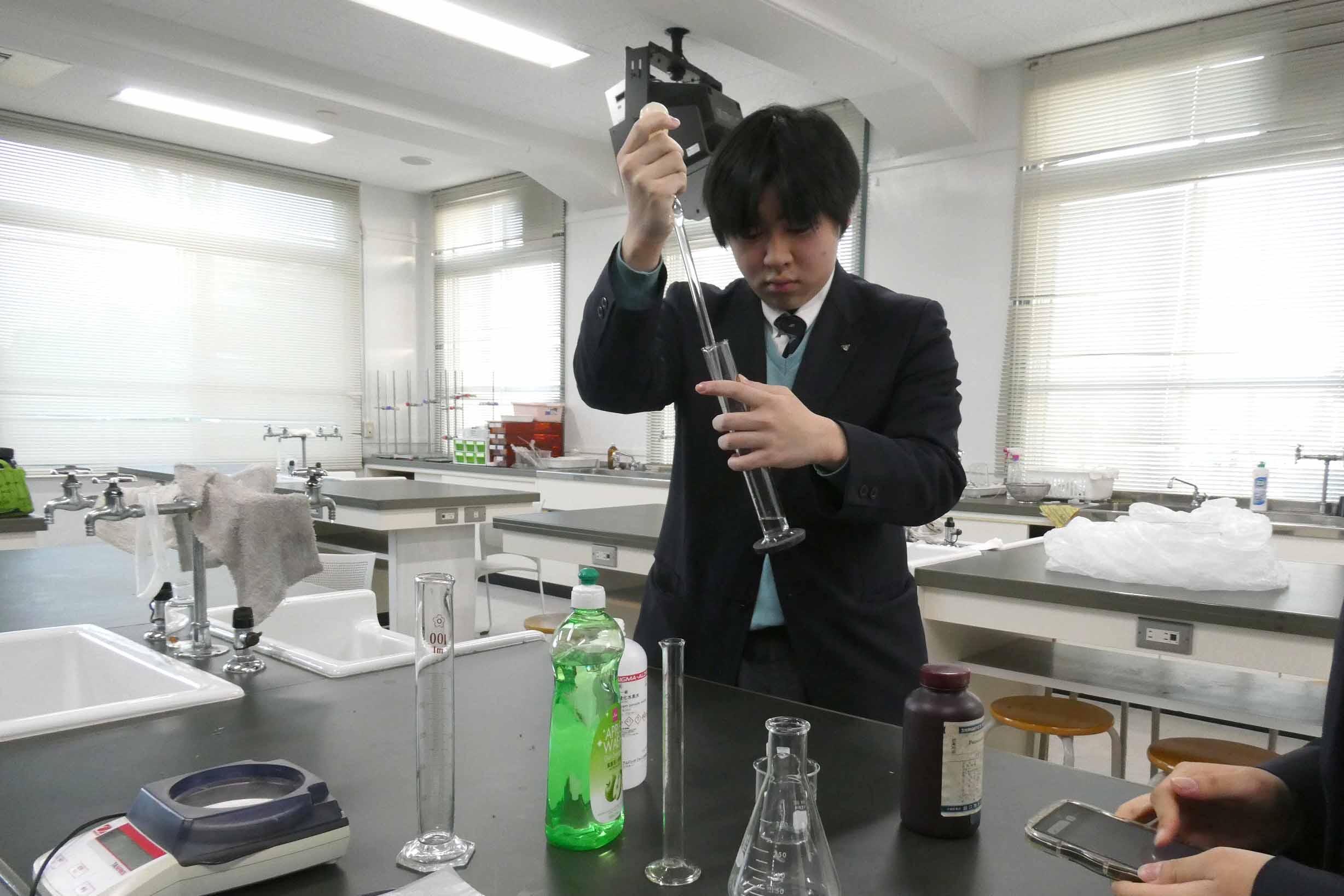 理科研究部では、卒業生を送るフェアウェルパーティーに向けてステージ発表の準備中。実際に実験を行い、本番で成功するかを確かめながら、練習を重ねています。