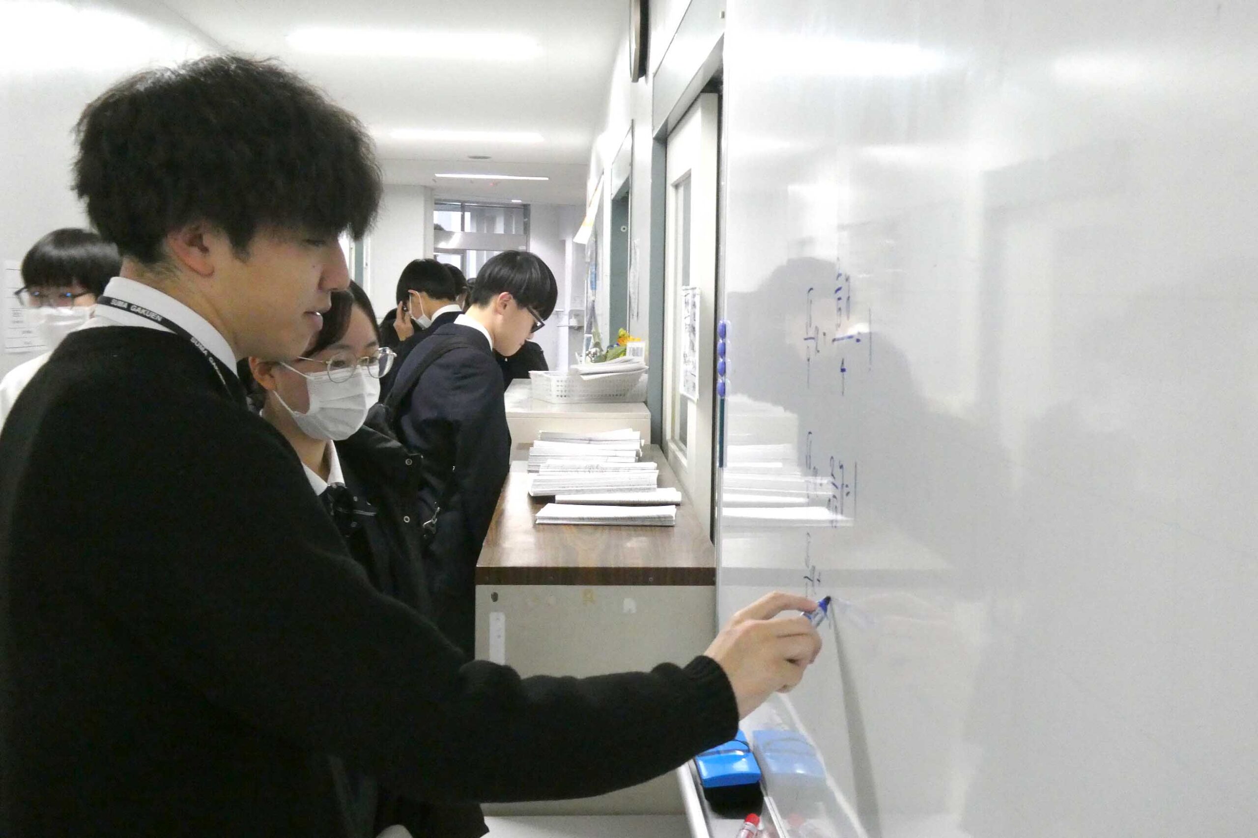 授業や課題で出た疑問は、職員室前のホワイトボードで教員に直接質問できます。この日は数学の問題について相談し、解法を一つひとつ確認して理解を深めていました。