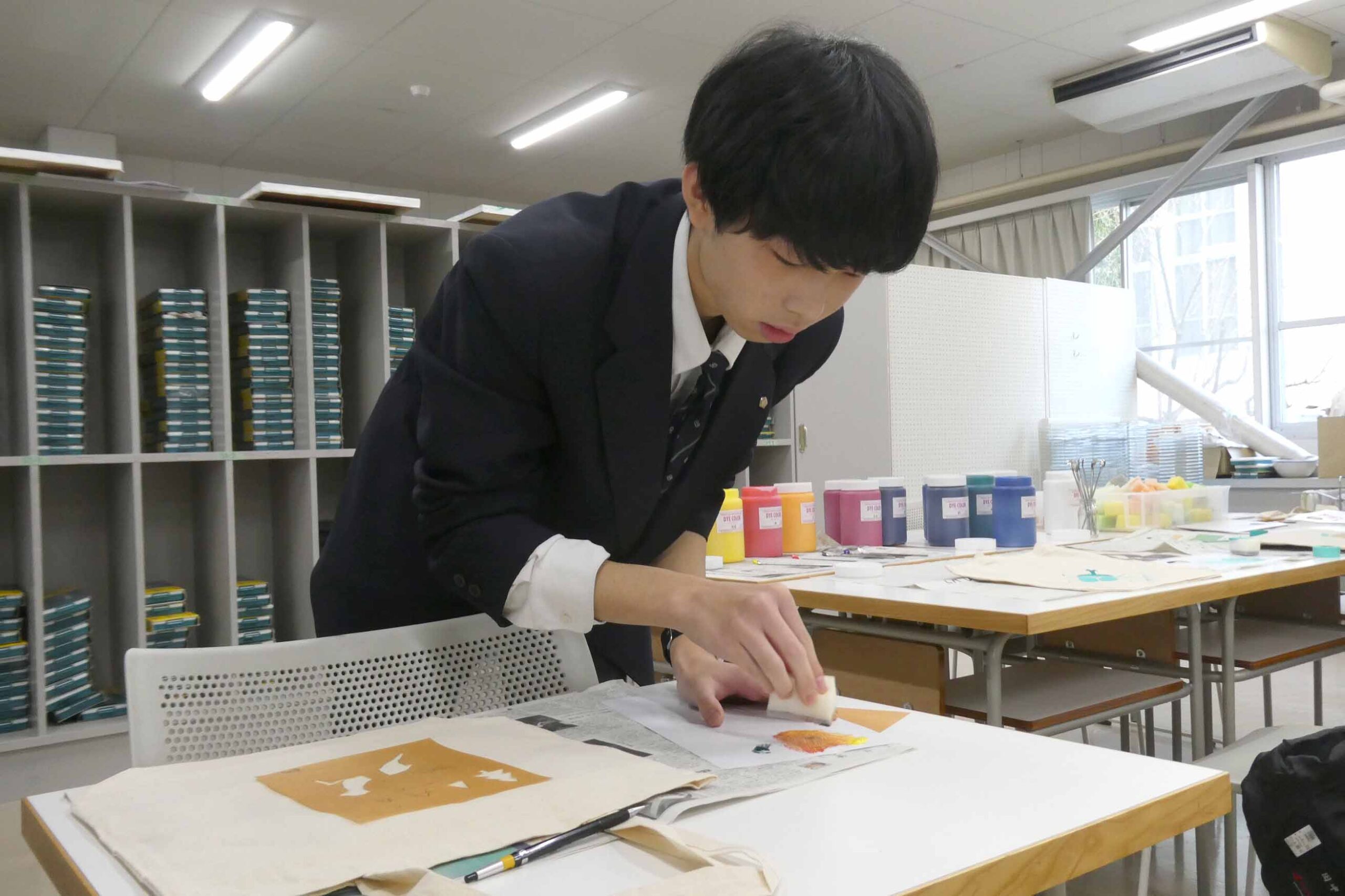K1/S2(高1)の芸術の時間では、美術の授業でステンシル染めのトートバッグ制作に取り組みました。目標は、主体的に制作活動を行い、ステンシルの基本的な技法を理解し習得すること。制作途中で考えたことや感じたことを記録し、次回の課題制作につなげます。生徒たちは発想豊かに、思い思いの作品づくりを楽しんでいました。