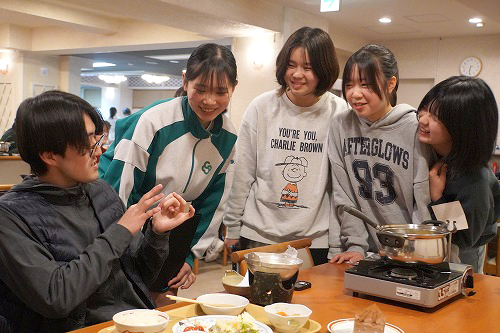 夕食時、うどんの出汁の美味しさに感動した生徒が、料理が得意な教員に成分や分量を質問。研修旅行中でも、普段と変わらないアットホームな雰囲気が感じられる一場面でした。