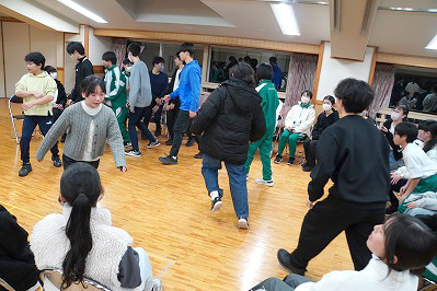 夜は生徒会企画のレクリエーションを実施。J1・J2混合班で対戦し、フルーツバスケットやクイズ大会など、生徒会の進行で会場は大いに盛り上がりました。
