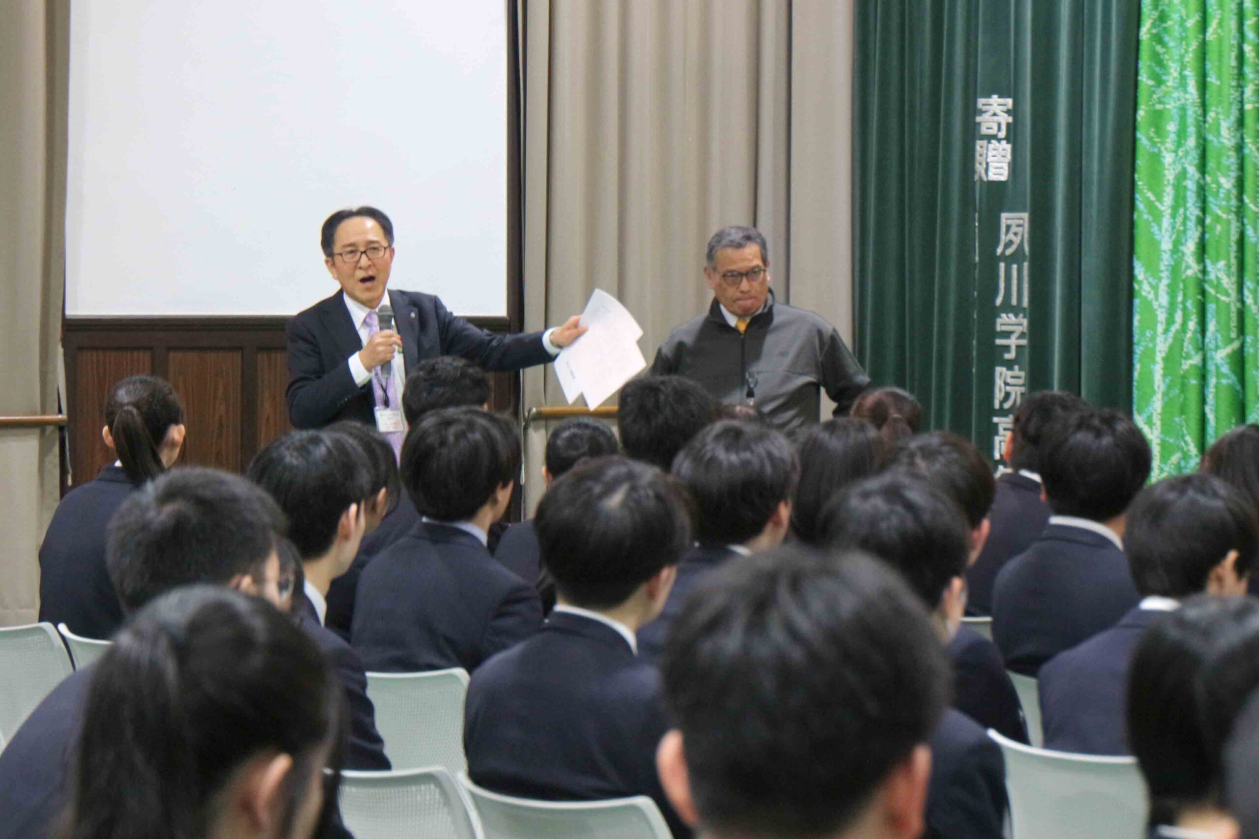 予行練習の後、高校校長と教頭からのアドバイスを受け、生徒たちはより良い式にするために細かい動きや声の出し方を確認しながら練習を重ねました。