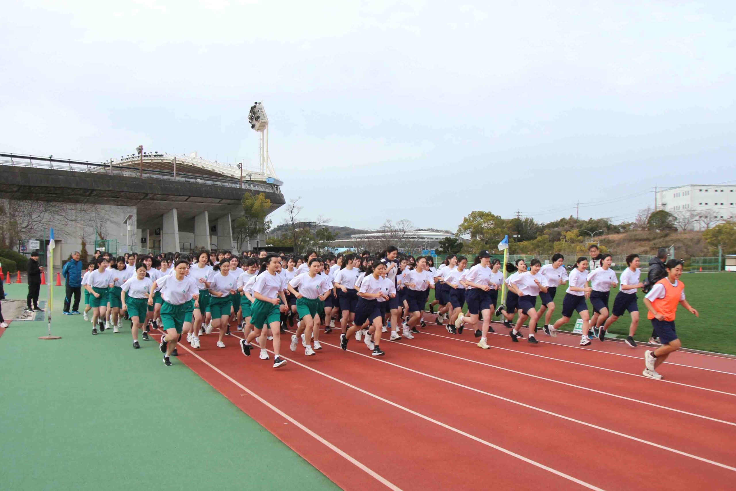 3月6日(金) K2/V1(高2)学年の2025年度マラソン大会を神戸総合運動公園で開催しました。スローガンは「Beyond Our Limits ~限界を超えて~」。姉妹校・須磨学園高等学校と合同で行い、互いに刺激を受けながらゴールを目指して力強く走り抜けました。