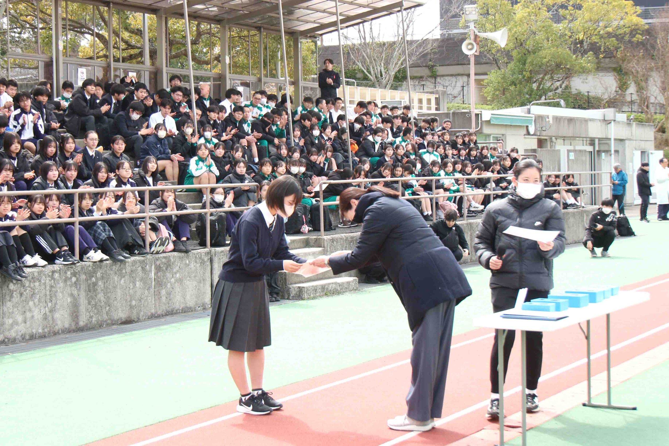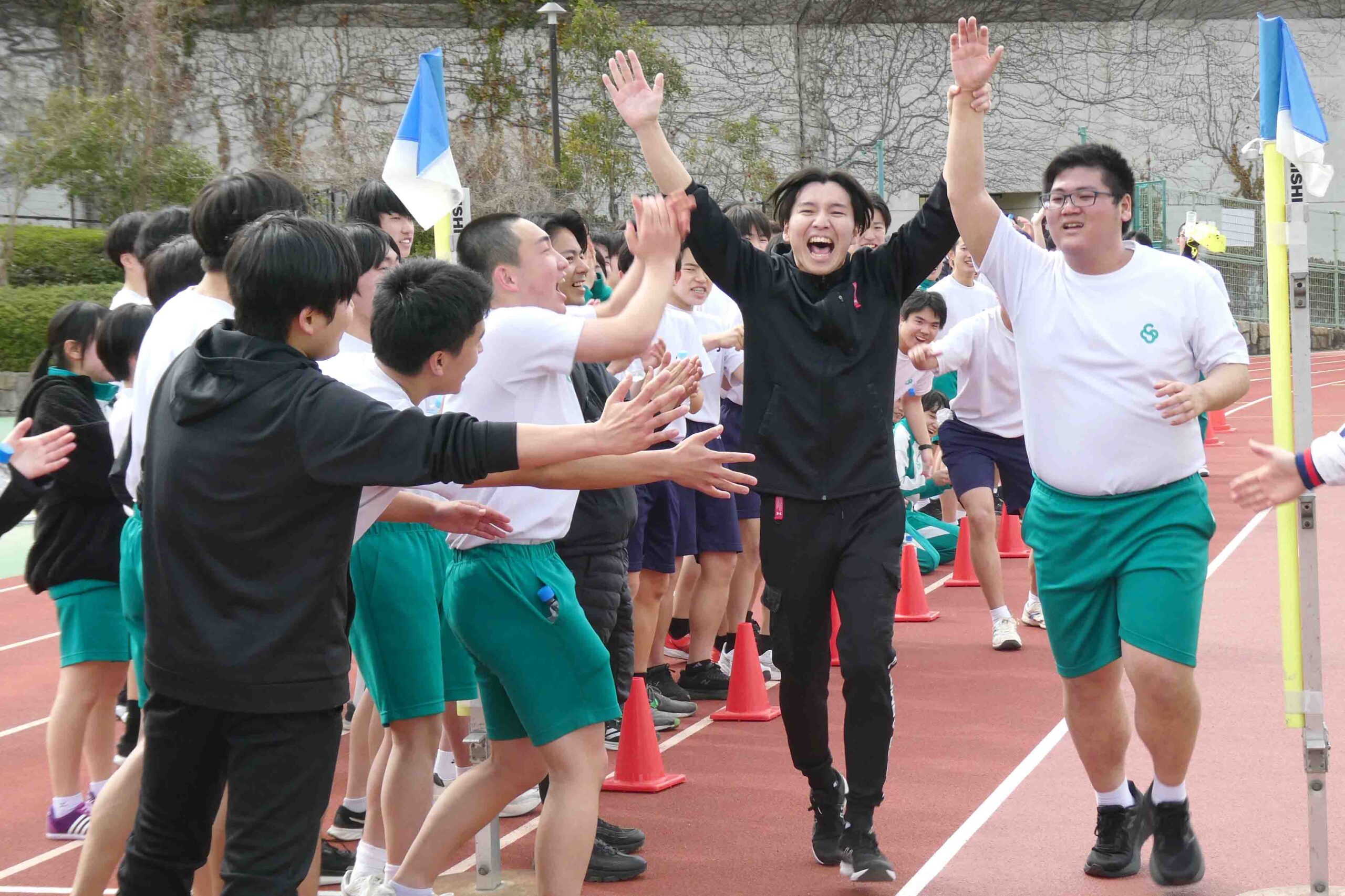 夙川の最終走者がゴールに近づくと、須磨学園高等学校と夙川の生徒たちが一体となって声援を送りました。ゴールの瞬間には、会場全体から大きな拍手が起こりました。