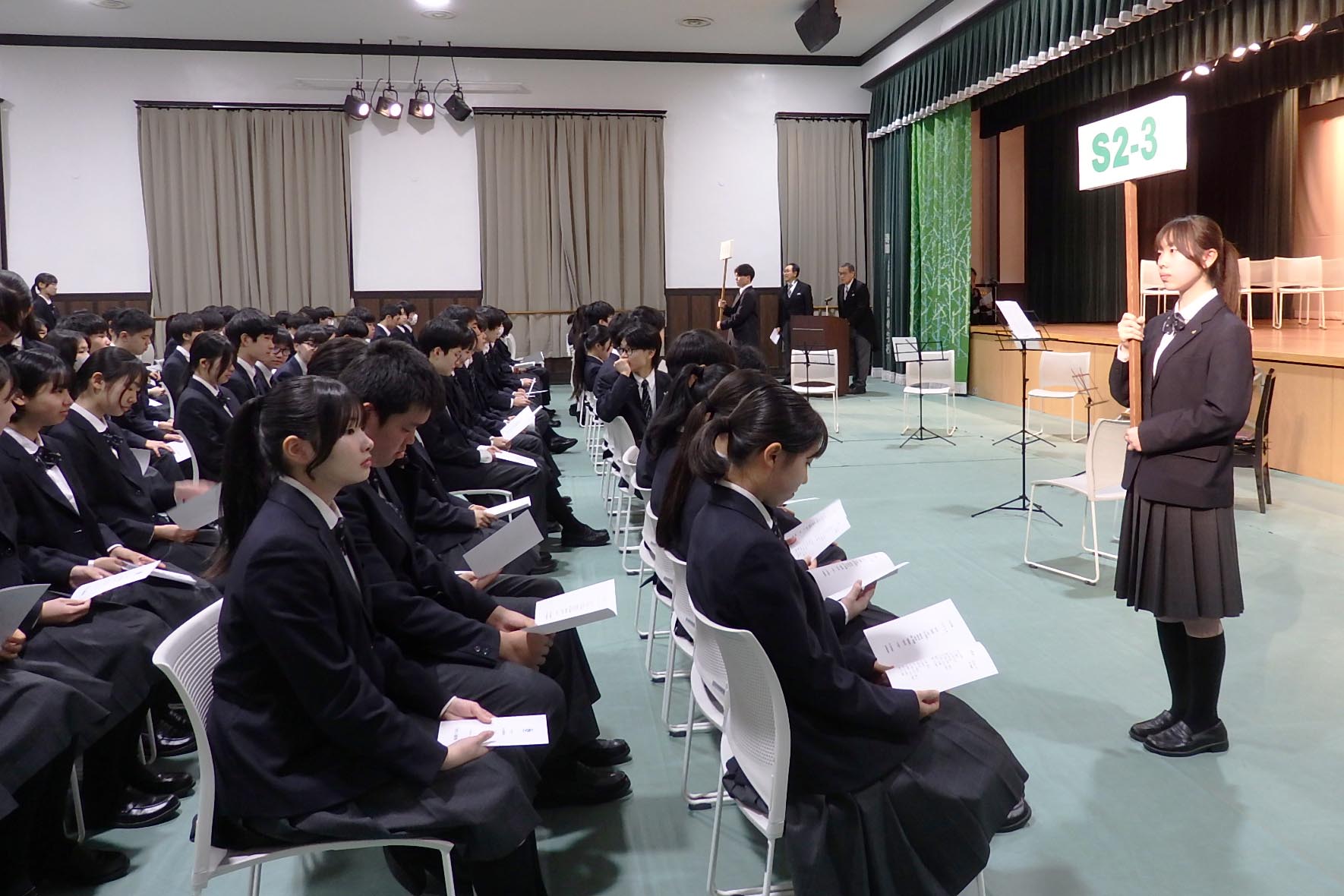 会場となる講堂に新入生が集まりました。先輩であるK2/V1(高2)生がプラカードを手に取り、入場の案内を行いました。