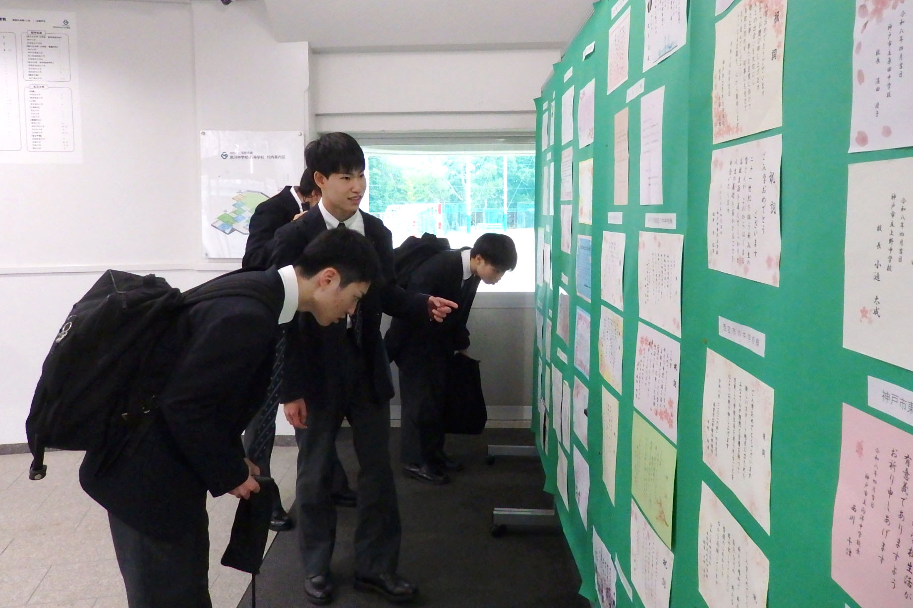 エントランスホールに、祝電・祝詞を掲示しました。たくさんの人に入学を祝福していただきました。